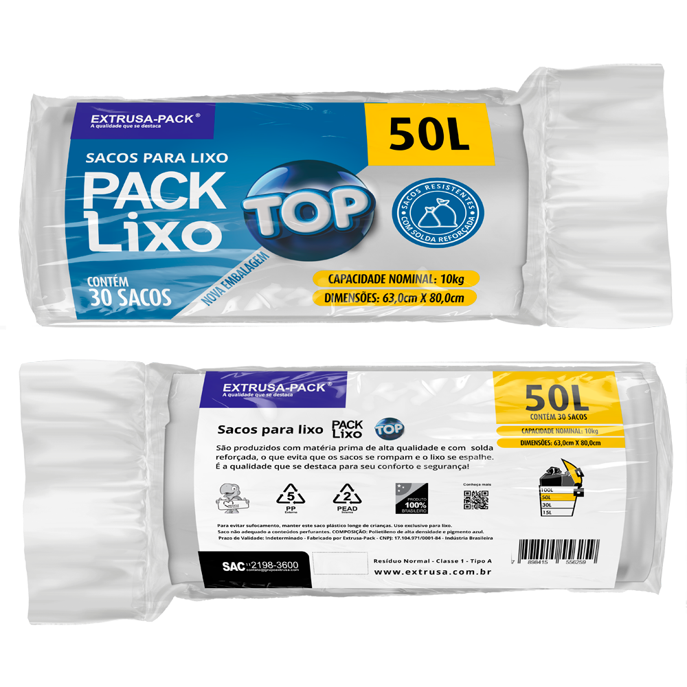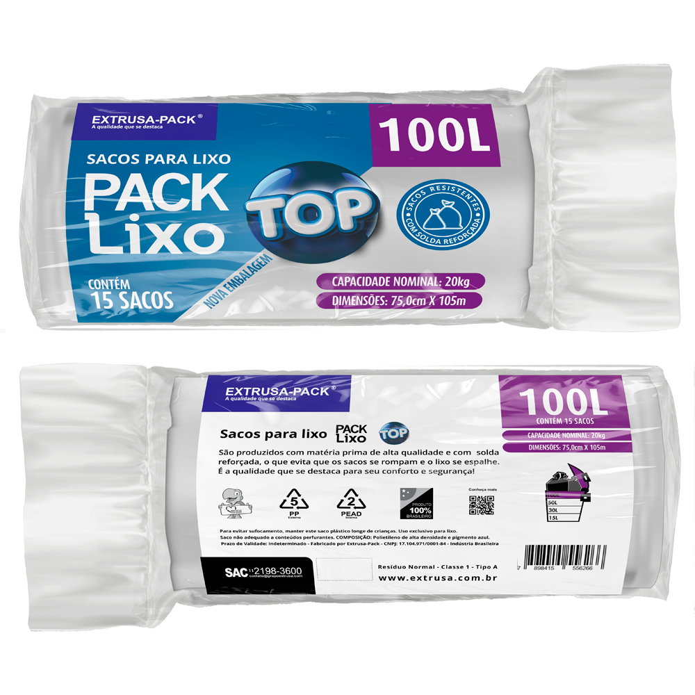 Conheça o Pack Lixo Top. Sacos para lixo reforçados disponível nas cores azul, branco ou preto, resistentes e fabricados com matéria prima reciclável fabricada pela Extrusa Pack.